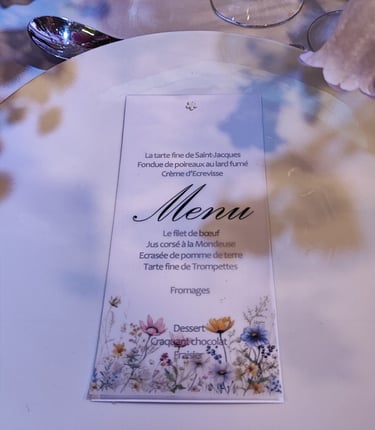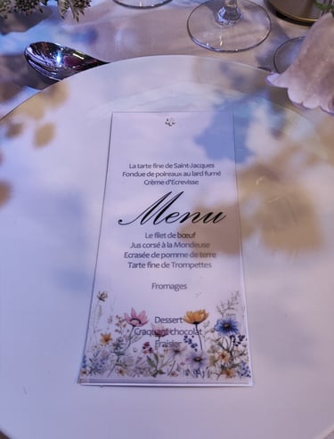 Nous sommes spécialisés dans la création de décorations personnalisées qui ajoutent une touche unique à votre événement. Que ce soit pour des menus, des plans de table soigneusement élaborés, ou toute autre forme de décoration, notre expérience et notre savoir-faire nous permettent de réaliser vos souhaits avec précision. Chaque élément est conçu sur mesure pour refléter votre style. Grâce à notre expertise, nous nous engageons à transformer votre vision en réalité, en veillant à ce que chaque détail soit en harmonie avec l'ensemble de votre décoration.